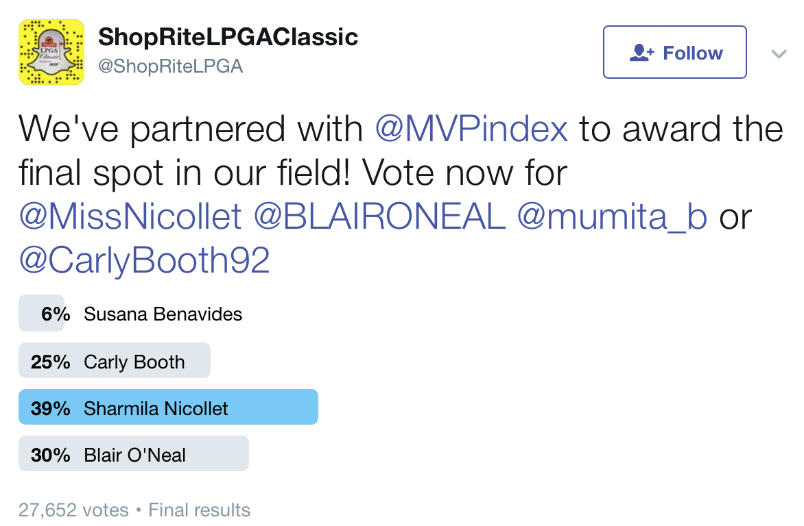 Lastly, social media can take you places. With a loyal following, there are so many opportunities that become available to you, as an athlete. For example, Golfer, Sharmila Nicollet is able to participate in ShopRite's LPGA Classic after her fans secured her a spot. This year, the tournament organizers decided to open one more spot to an athlete with a loyal social media following. They created a Twitter poll asking which pro golfer should be invited to their tournament, and Nicollet won! The relationship she created with her followers was the only reason she was invited to the LPGA Classic.