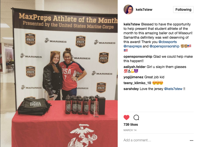 Matt Goudreau, Director of Integrated Marketing at CBS Interactive, said “"Creating my first campaign via OpenSponsorship's platform was not only easy and seamless but provided us here at CBS Sports/MaxPreps great talent options for our High School Athlete of the Month campaign. We received quick responses & strong candidates to choose from, that met all our criteria. Kelsey Stewart was selected and helped honor one of our award winners. She met and exceeded our expectations by being well spoken, professional and aligned perfectly with what we were looking for to help represent our brand. She even wore her US National team jersey to provide more excitement for the kids she engaged with, and all around was great to work with."