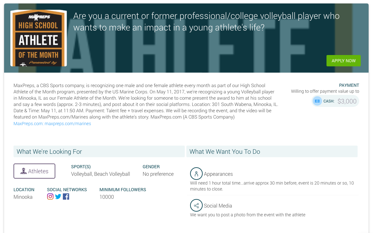 Every month, MaxPreps creates a Campaign on OpenSponsorship for each event, which takes about 10 minutes to fill out on our website. They include the time, date, deliverables needed from the athlete, and even the budget they are willing to pay all in their Campaign. This assures that every athlete who applies is extremely interested in accepting this offer and then it is up to the brand to decide on which athlete to work with, already knowing they have interest from each athlete. You can see an example Campaign below for their upcoming event in May.