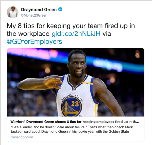 Draymond shared the resulting article with his 1.2 million Twitter followers, which resulted in a 952% increase in Twitter referral traffic for Glassdoor. This was one of our most successful athlete sponsorship deals because Green and Glassdoor worked together to create a campaign that both parties were excited about. The campaign was very successful for Glassdoor because of the massive uptick in traffic to their website.